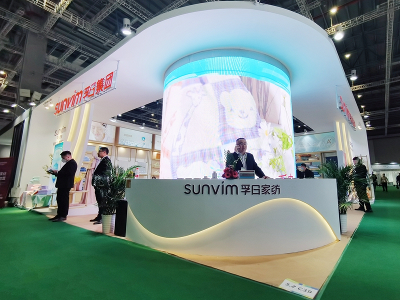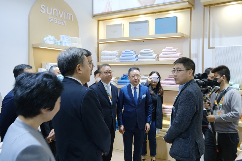 (圖為孚日集團副總經(jīng)理、國內(nèi)品牌運營總負(fù)責(zé)人孫浩博帶隊參加上海春夏家紡展,中國紡織工業(yè)聯(lián)合會會長孫瑞哲、中國紡織工業(yè)聯(lián)合會副會長、中國家用紡織品行業(yè)協(xié)會監(jiān)事長楊兆華參觀孚日展位)